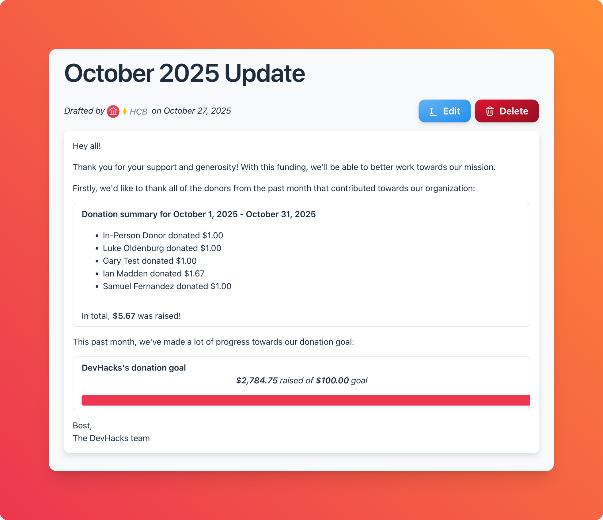 If you have feedback or feature requests, I'd love to hear them. Let me know your number one complaint about HCB by replying to this email.