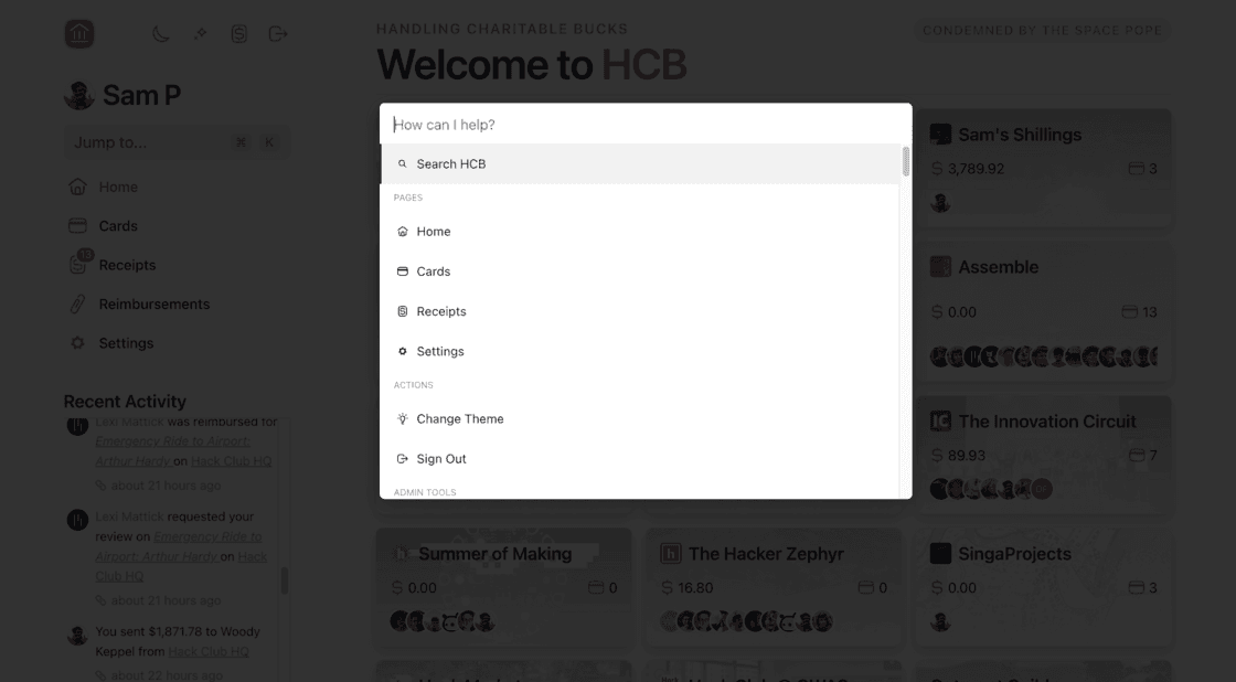Before building app features, though, we needed a robust API on HCB itself. Over several months, we expanded our v4 API to support functionality like creating cards, managing receipts, and inviting users to HCB organizations.
